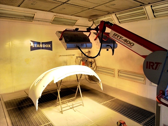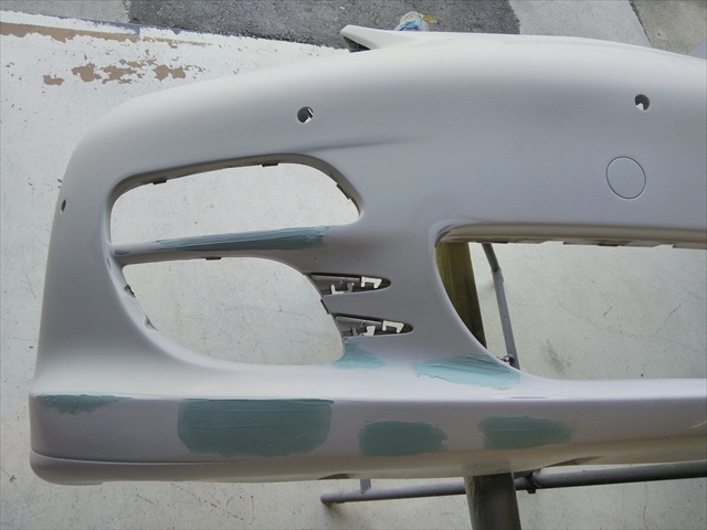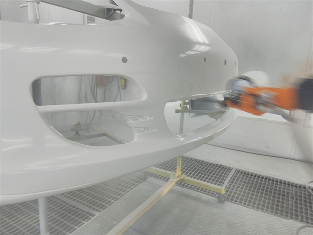 修理完了後、フロントバンパーすべてに2液硬化型サフェーサーを塗装して、近赤外線短波乾燥機で強制乾燥を行います。