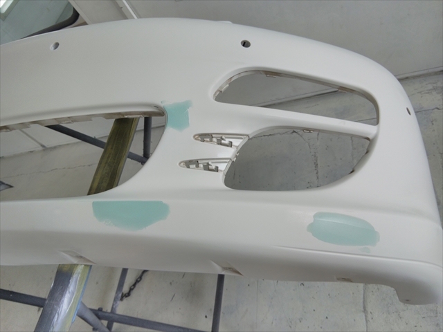 飛び石傷はサンディング(研磨)作業で処理できましたが、その他にも深い擦り傷や塗膜の割れもありましたので、パテでオリジナルの形状に整えながら修理します。
