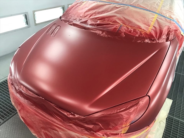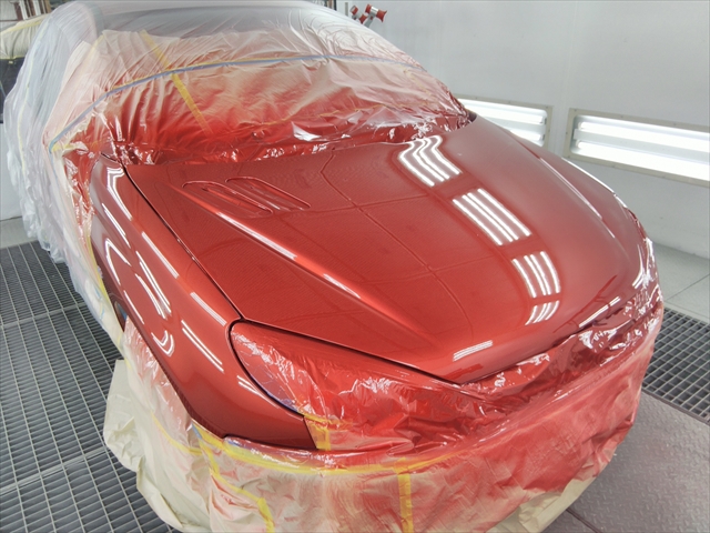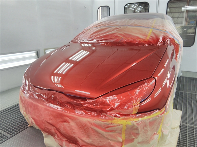 多角型分光測色機「アクワイヤーRXスタンダード」で正確に調色した環境にやさしい水性ベースコートを、チリやホコリをシャットアウトした塗装ブース内で慎重に塗装します。ベースコートの上にはVOCクリヤーを塗装後、塗装ブース内で温風による乾燥及び、近赤外線短波乾燥機による2工程の強制乾燥を行います