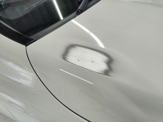 メルセデスベンツ・GLAのボンネットはアルミ製なので無理に叩いたり、高温を与えりすることは、アルミ素材その物の組織に影響を与えてしまいます。今回はヘコミが非常に小さく浅かったため、パテで形状を整え修理しました。
