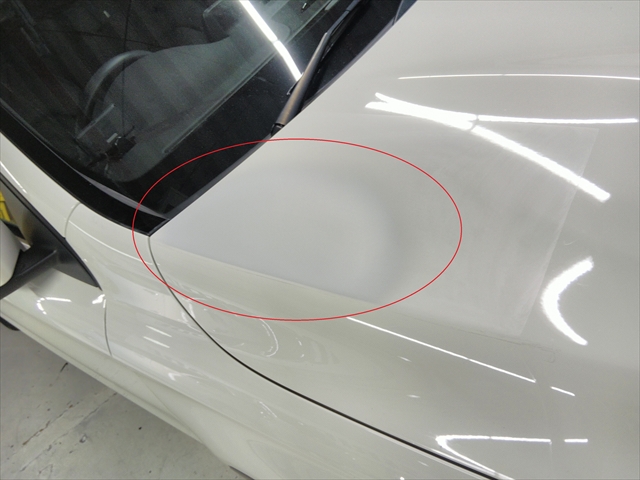 塗膜に損傷はありませんでしたが、オーナー様は新車で購入してまもなく、とても気になる場所のヘコミなのでシッカリと修理してもらいたいとのご要望でした。見積り金額のご提示と修理内容をご説明をして納得いただき、メルセデスベンツ・GLAをお預かり致しました。