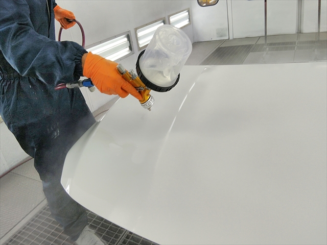 多角型分光測色機「アクワイヤーRXスタンダード」で正確に調色した環境にやさしい水性ベースコートを、チリやホコリをシャットアウトした塗装ブース内で熟練スタッフが慎重にメルセデスベンツ・GLAを塗装します。ベースコートの上にはVOCクリヤーを塗装して塗装ブース内で温風による乾燥及び、赤外線短波乾燥機による2工程の強制乾燥を行います。