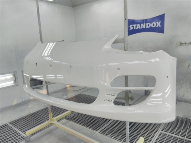 修理完了後、フロントバンパーすべてに2液硬化型サフェーサーを塗装して、近赤外線短波乾燥機で強制乾燥を行います。
